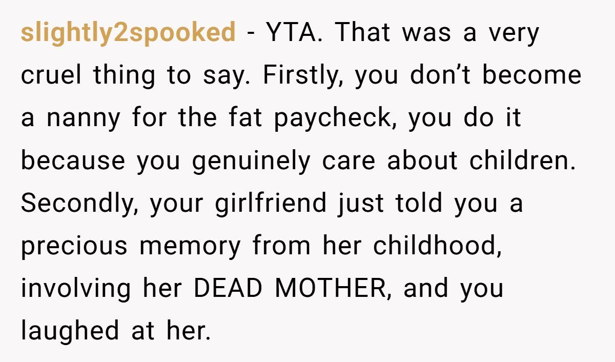 Imagine laughing at your girlfriend’s cherished Mother’s Day memories with her nannies, then telling her they only loved her for a paycheck! One Redditor, a 21-year-old man, did just that after his wealthy girlfriend shared how she honored her nannies, who raised her after her mother’s death.
