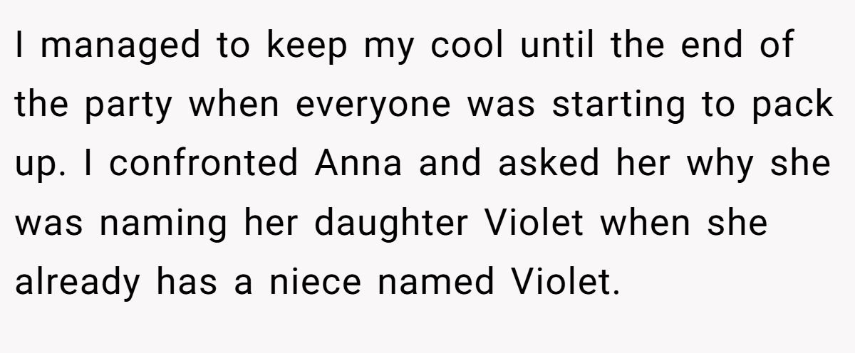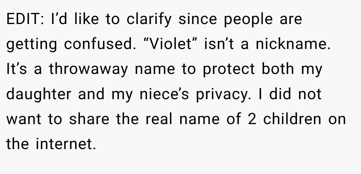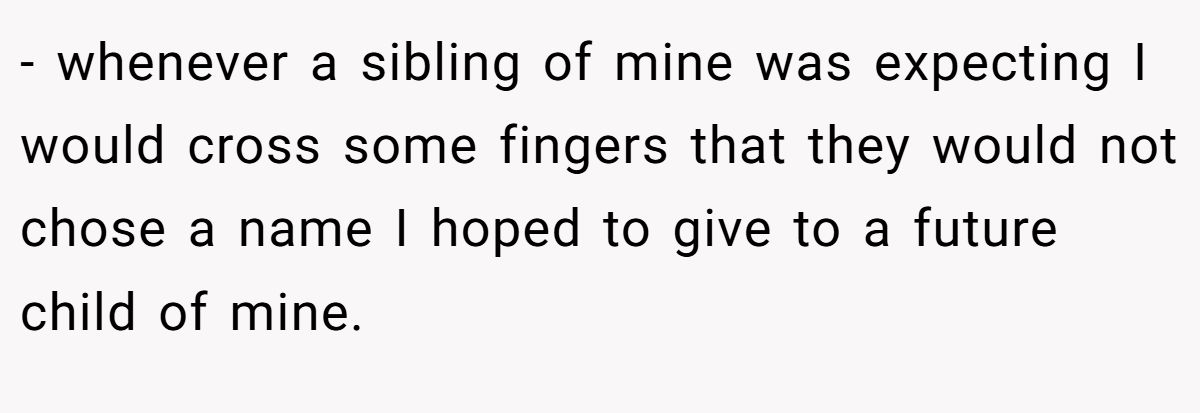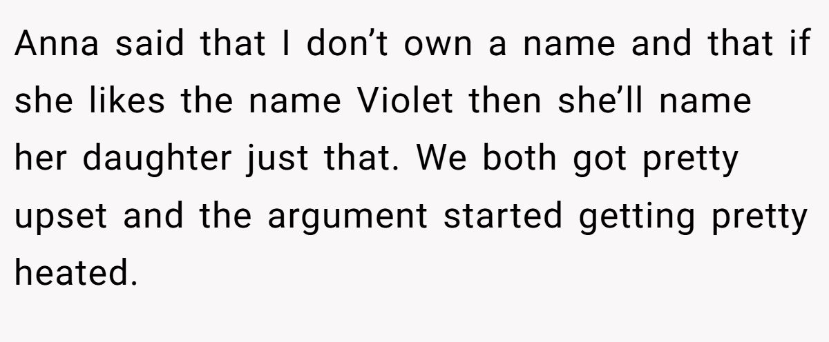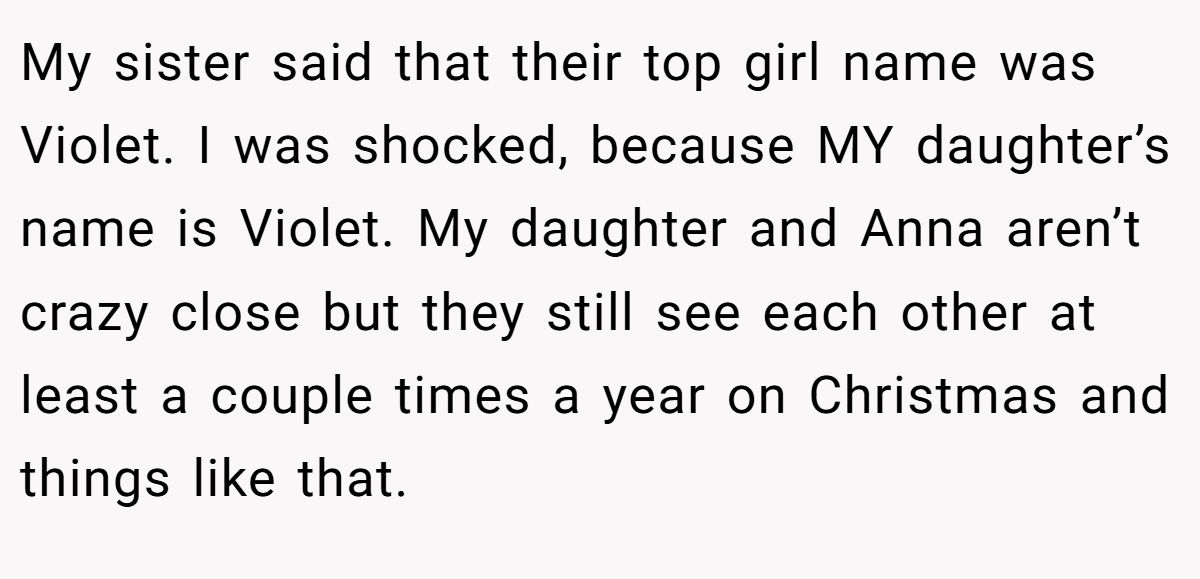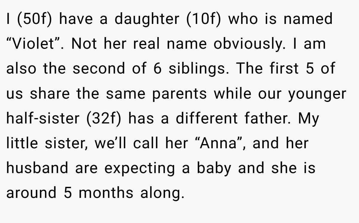 In this Reddit tale, the original poster (OP), a 50-year-old mom of a 10-year-old named “Violet” (not her real name), found herself stunned when her 32-year-old half-sister, Anna, revealed the same name as her top baby pick. What was supposed to be a sweet family moment quickly turned into a mini soap opera. Anna doubled down—“you don’t own a name”—while OP couldn’t believe someone in the same family would duplicate such a defining identity.