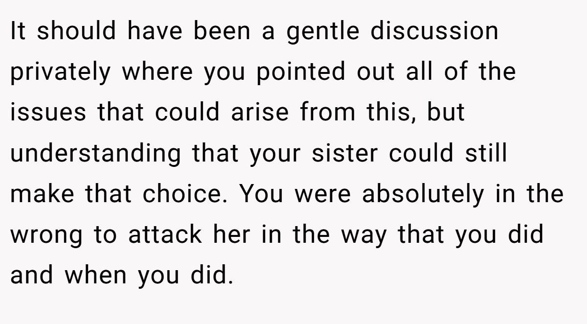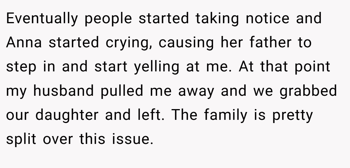 In hindsight, confronting Anna at the party—with guests, frosting, and family tension all in the mix—was probably not the most graceful move. A calm private conversation may not have changed the outcome, but it could’ve preserved the peace.
