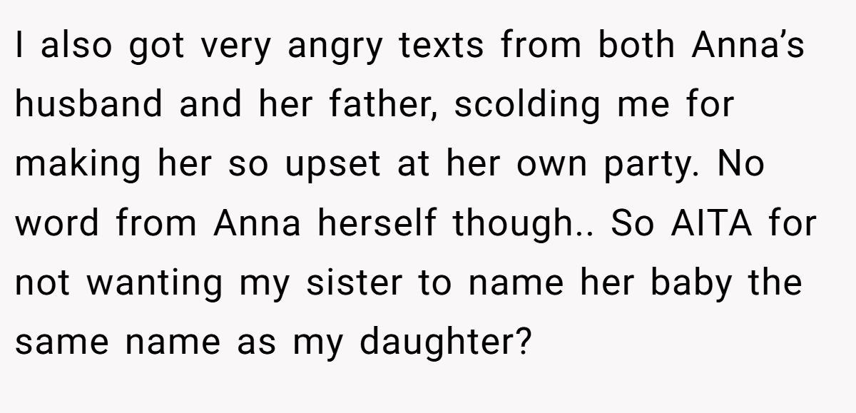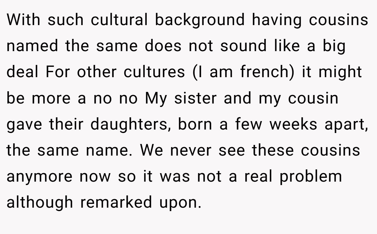 Yet from Anna’s perspective, the name wasn’t off-limits. Maybe she didn’t feel close enough to her niece for it to matter. Maybe the name carried meaning to her that OP never knew. And, as cultural norms vary, some families see shared names as bonding, not betrayal.
