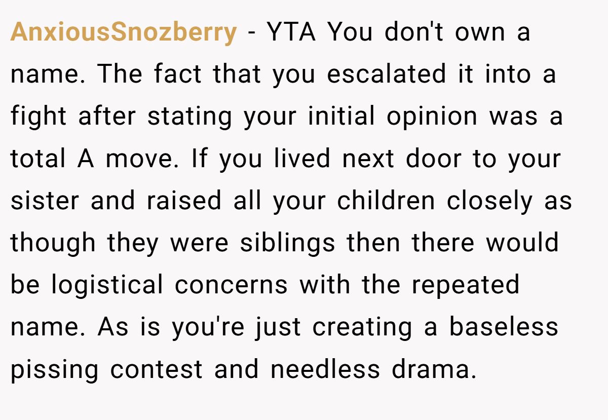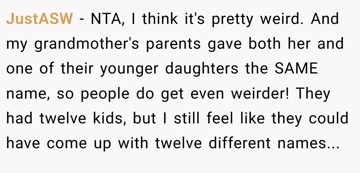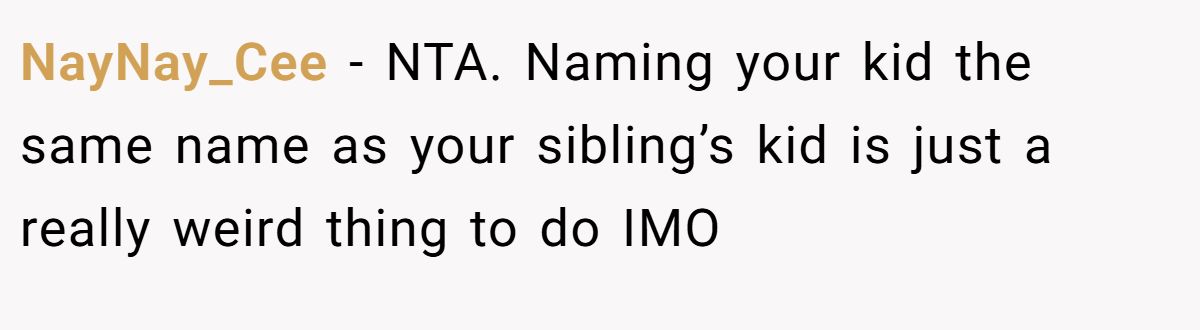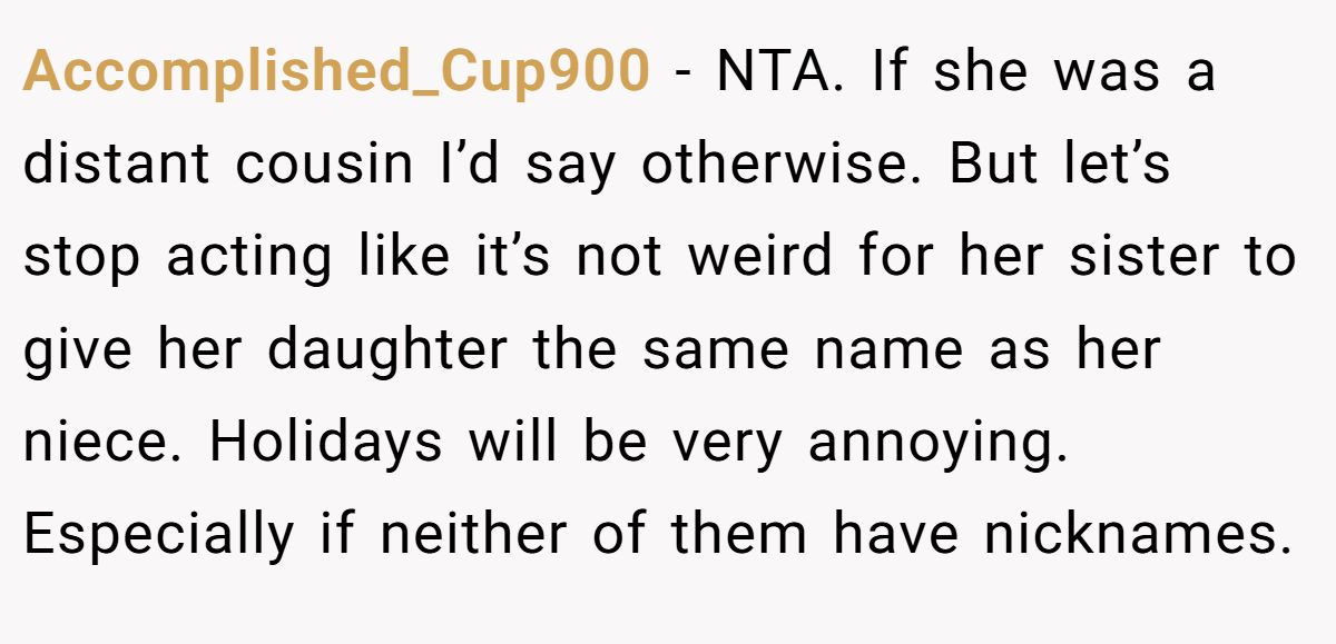 A commenter backed OP, saying it’s definitely weird for a sister to reuse her niece’s name—especially with no nicknames to tell them apart.