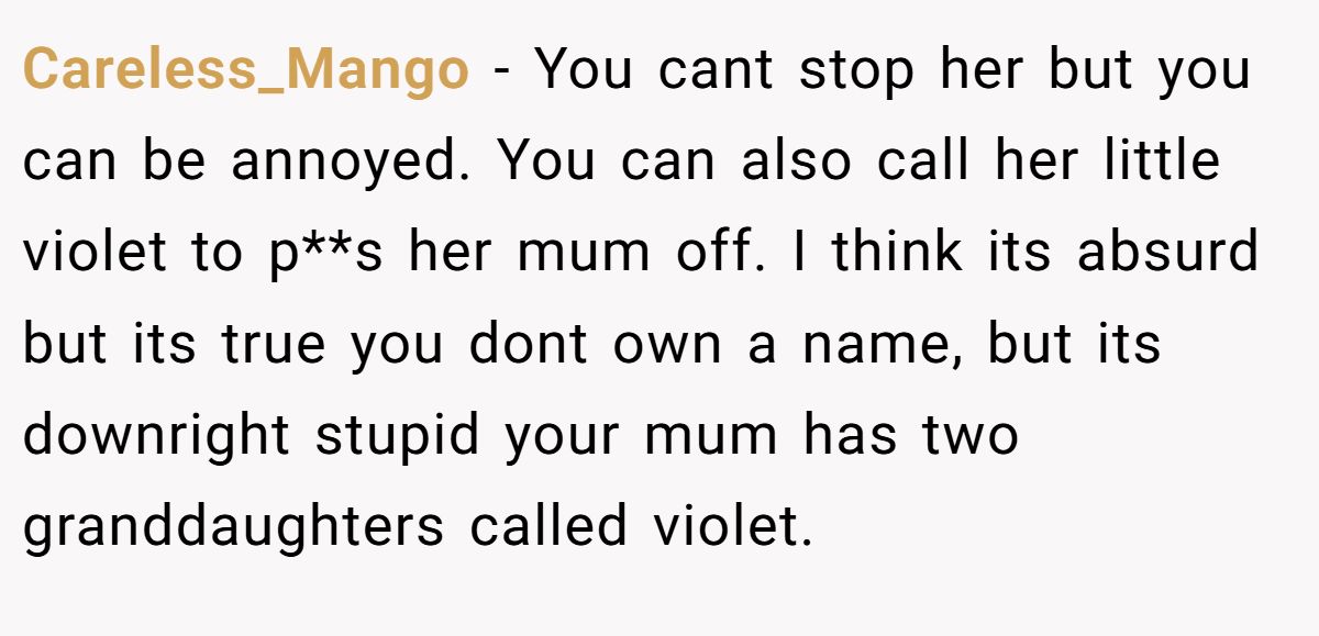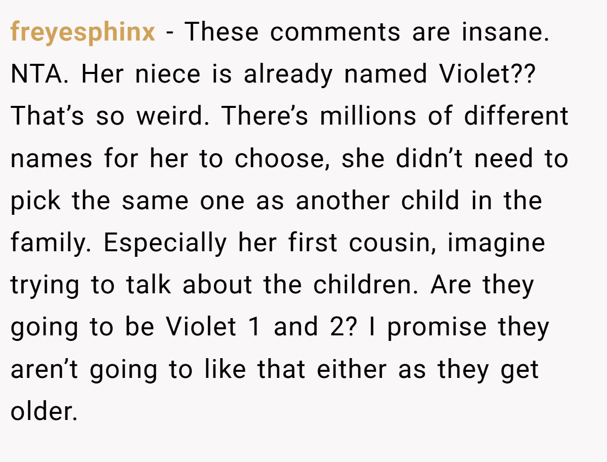 One commenter said OP has every right to be annoyed—even joked about calling the baby ‘Little Violet’ just to annoy her sister—but admitted no one owns a name.