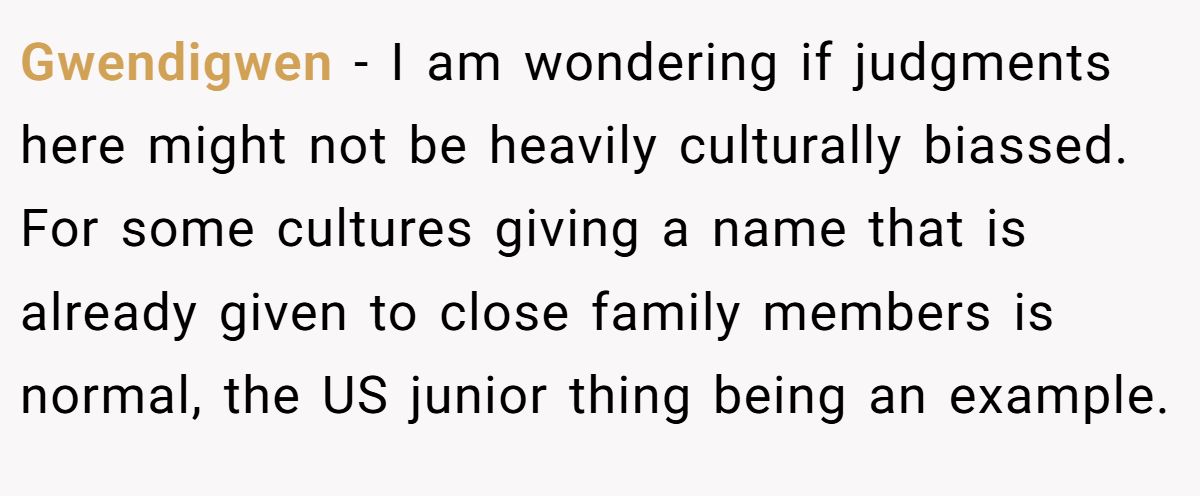 One commenter pointed out that name-sharing norms vary by culture—what feels like a big deal in one family might be totally normal in another.