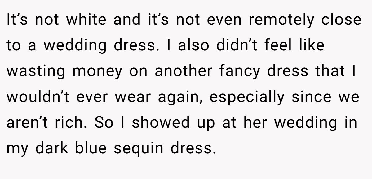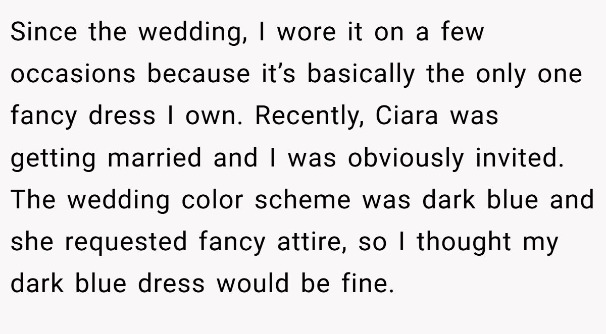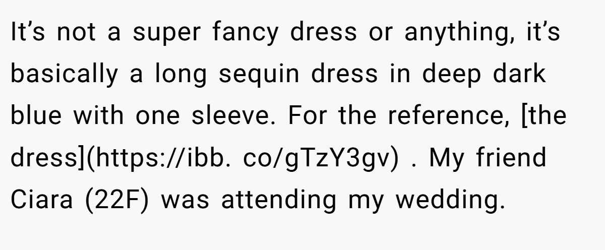 Talk about a wedding-day plot twist that could rival a rom-com gone wrong! This Redditor’s decision to wear her dark blue sequin dress—her go-to for fancy events, including her own low-key wedding—sparked a bridal meltdown that left guests stunned. Ciara’s accusation of “upstaging” seems overblown, but was the Redditor wrong to recycle her dress, or is Ciara’s tantrum the real party foul?