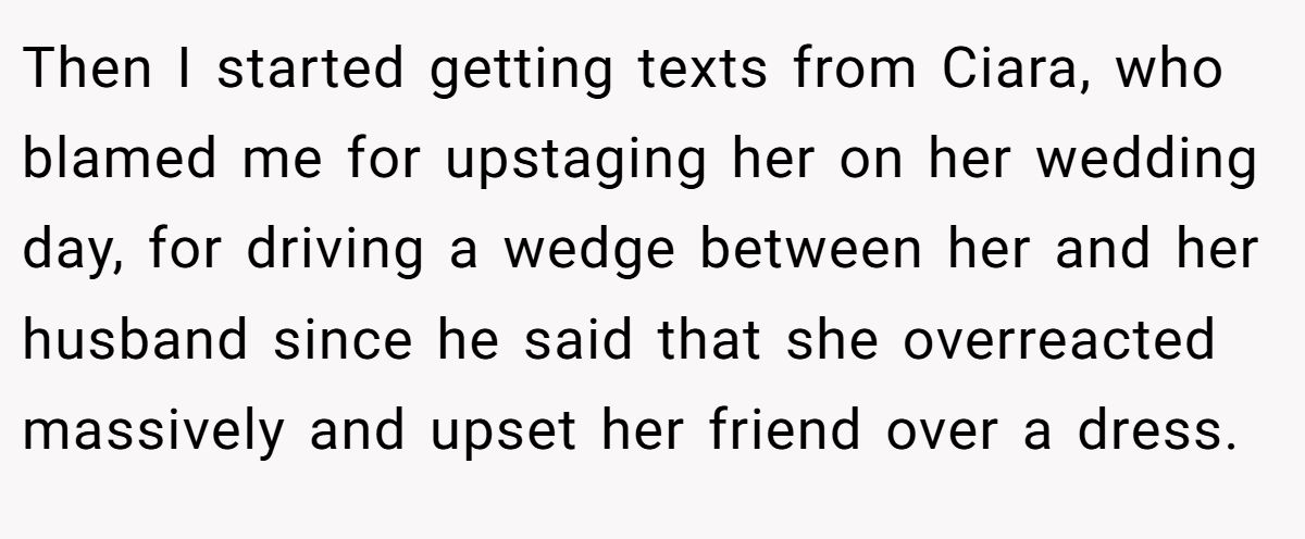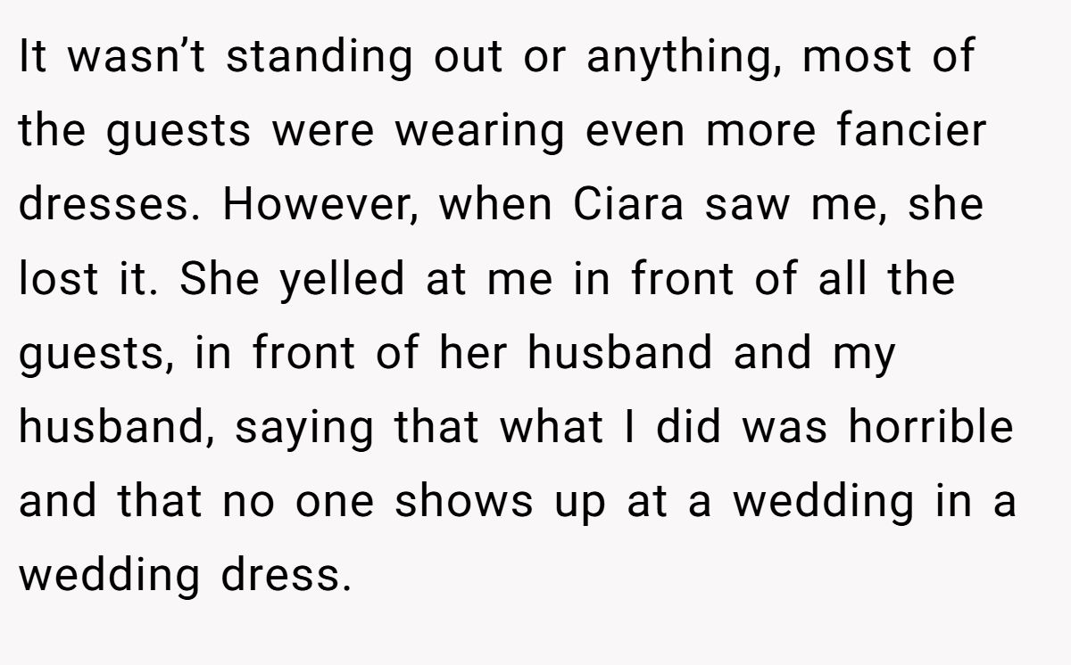 So when her friend Ciara saw her in that dress at her own wedding, the bride flipped out in front of everyone, accusing her of stealing the spotlight. Was it truly a fashion faux pas or just bridal overreaction in sequined disguise? Grab your imaginary champagne and read the full story below.