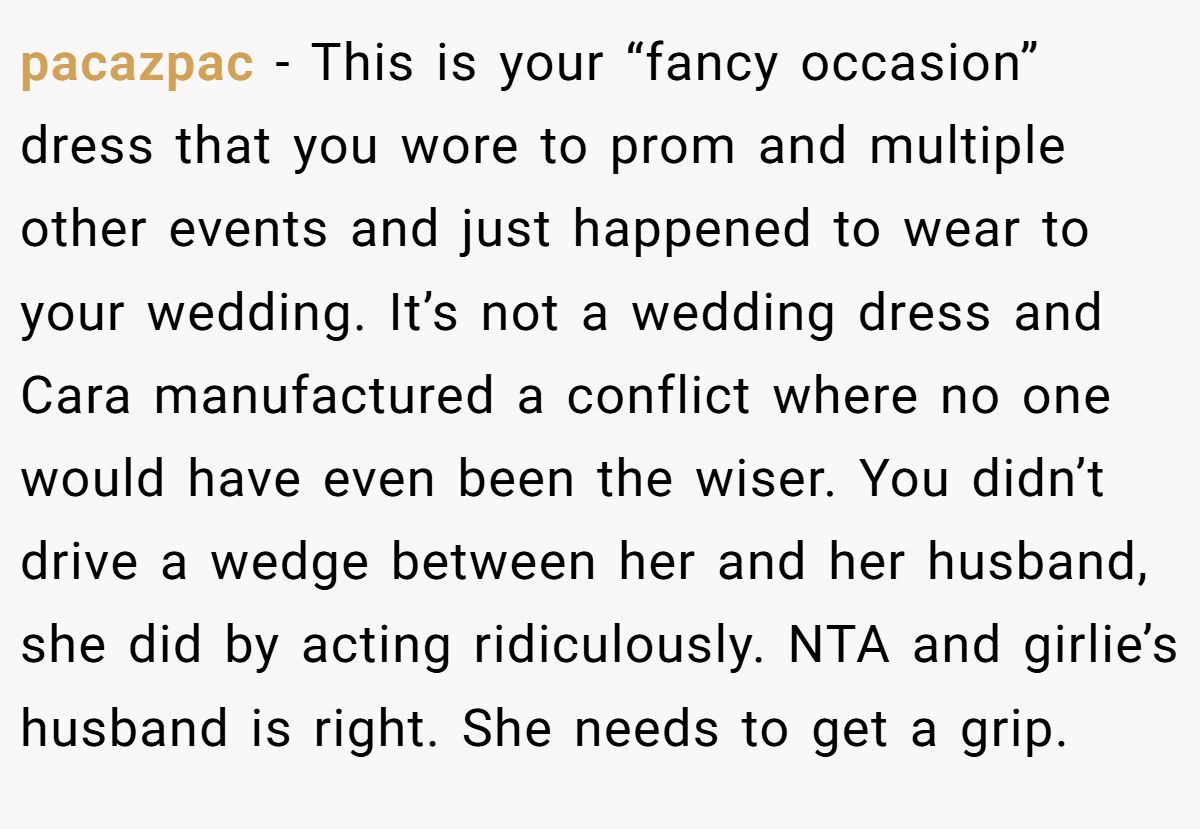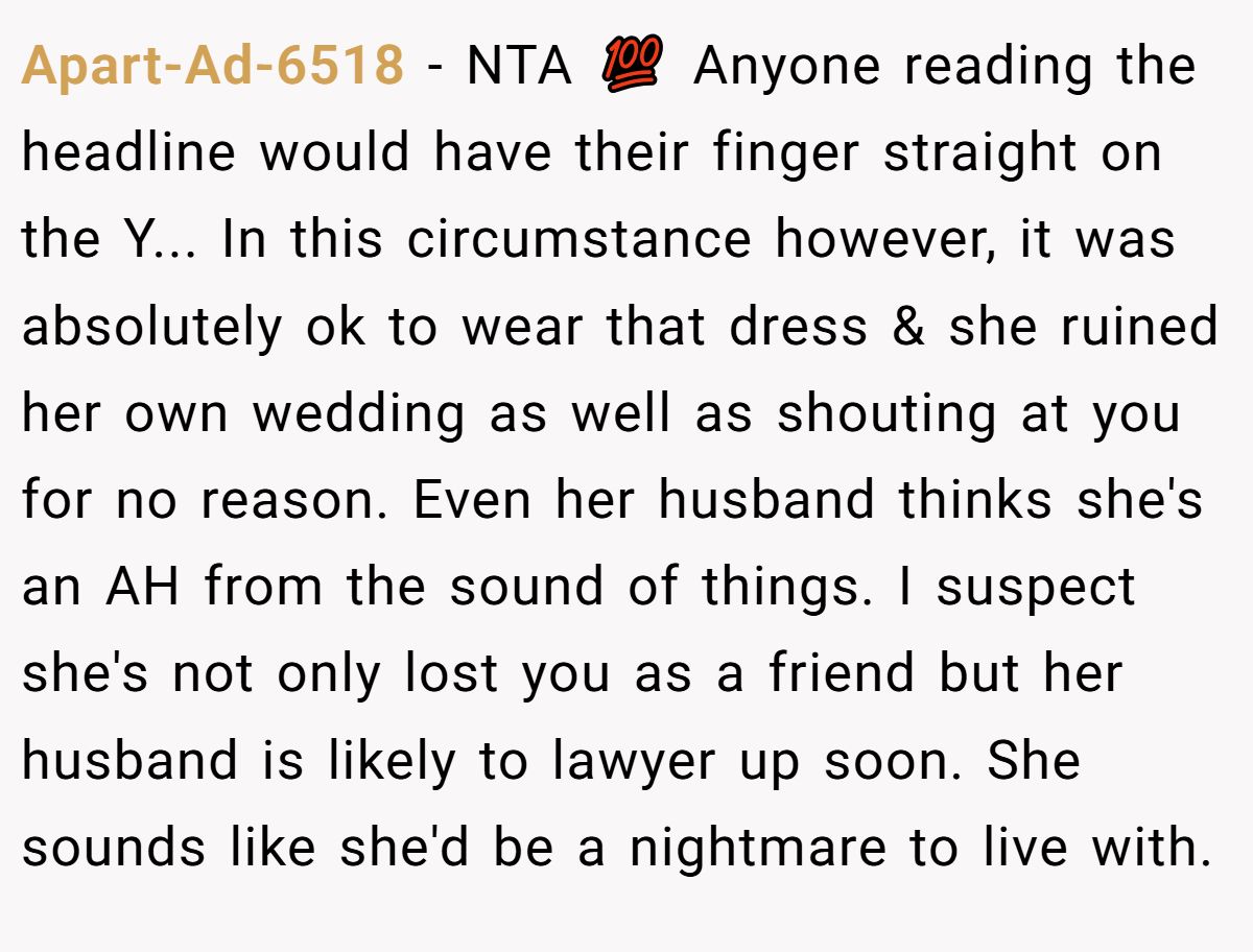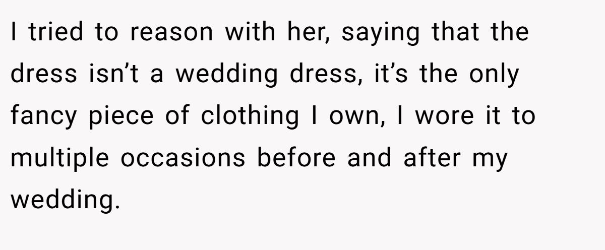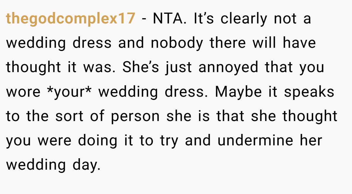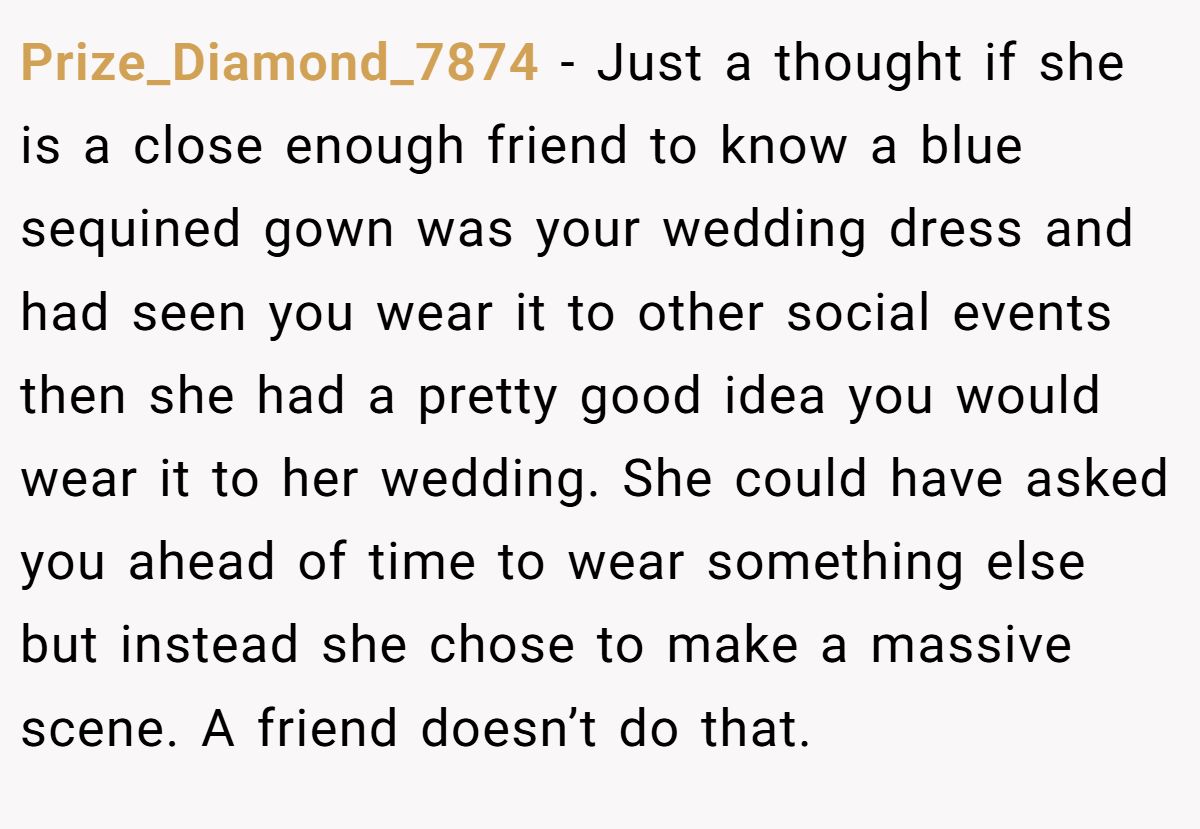 Was there a better way? The Redditor could’ve checked with Ciara beforehand, but her frugal choice was reasonable, given her financial constraints. Ciara’s meltdown, not the dress, stole the spotlight, as guests likely remembered her tantrum over the Redditor’s outfit. Neutral advice? The Redditor should stand firm but consider a calm talk with Ciara to clear the air, if the friendship’s worth saving. What do you think—fashion faux pas or bridezilla overreach?