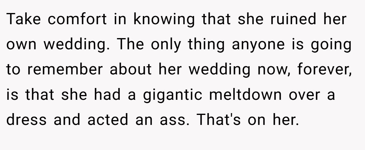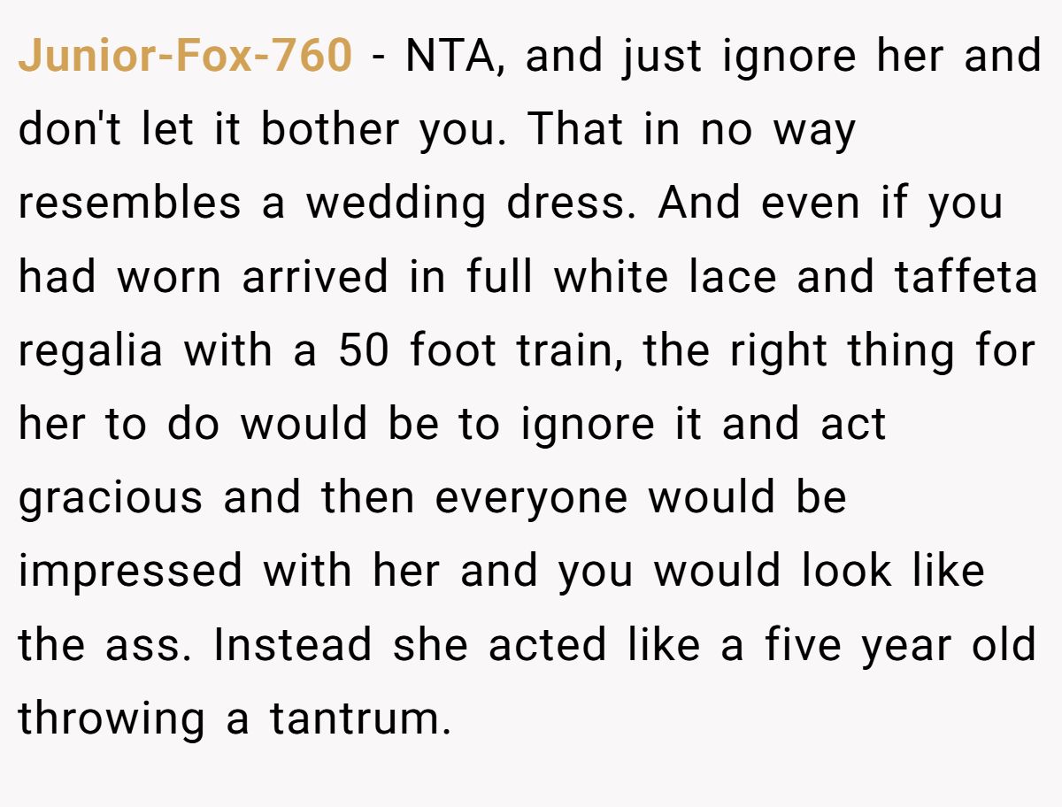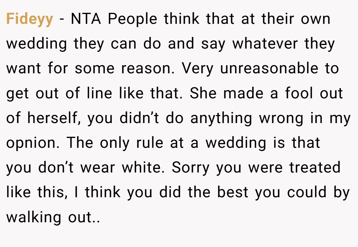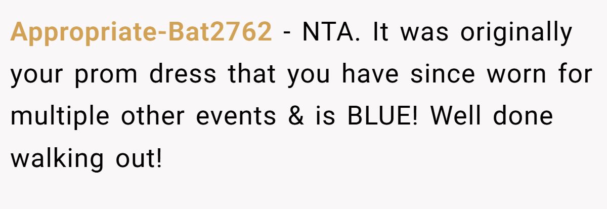 This person applauded the Redditor for walking out, stressing the dress’s non-bridal vibe.