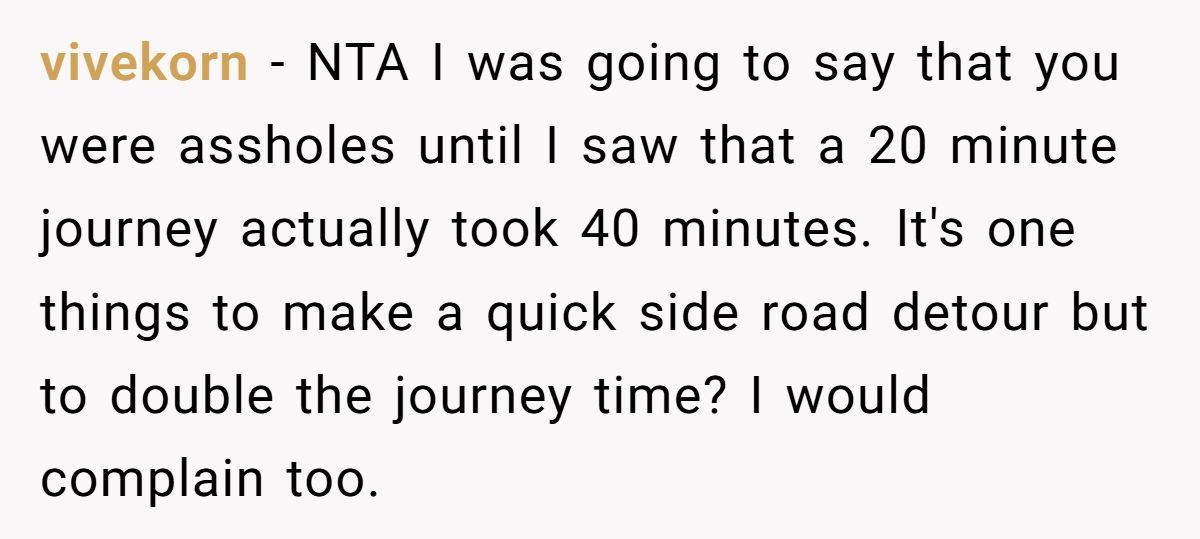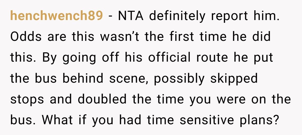 Commenters supported reporting the driver, citing the doubled trip time as unacceptable, potentially disrupting schedules or other passengers