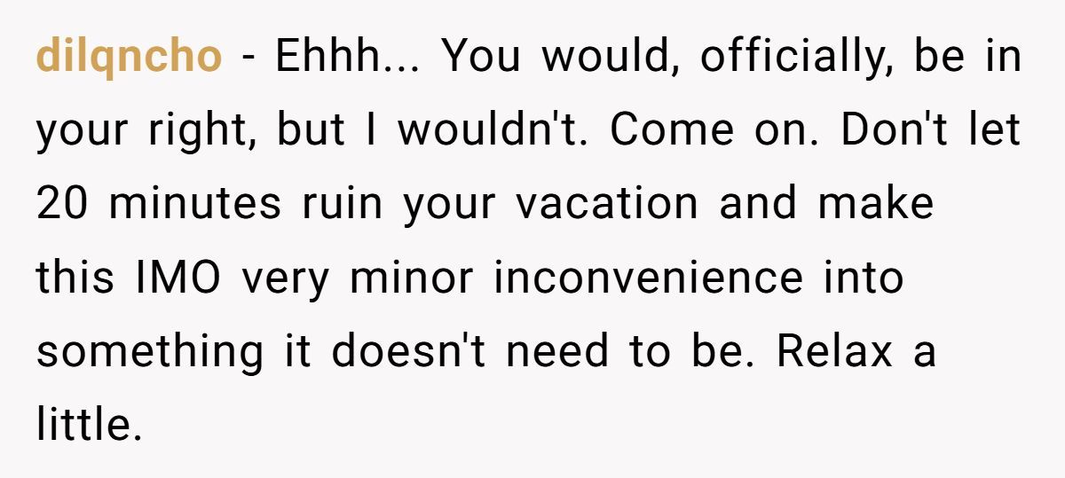 Users argued the 20-minute delay was no big deal on a vacation, urging her to relax and not escalate a minor issue