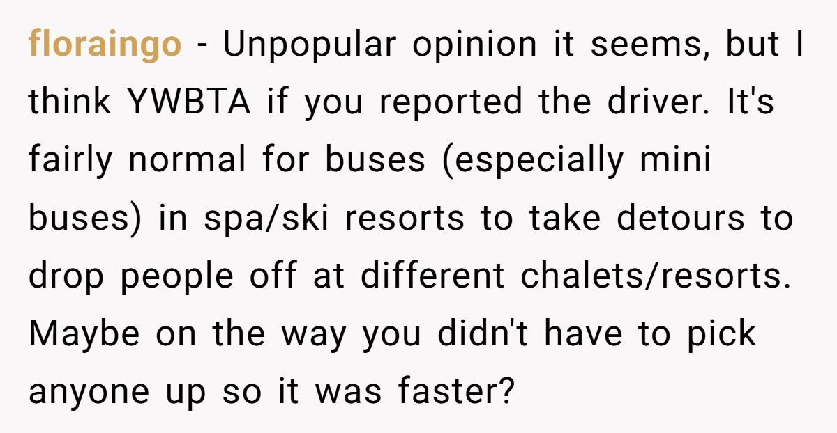 One woman shared on Reddit how a bus driver’s detour to drop off friends during her Alpine vacation sparked a debate about reporting him