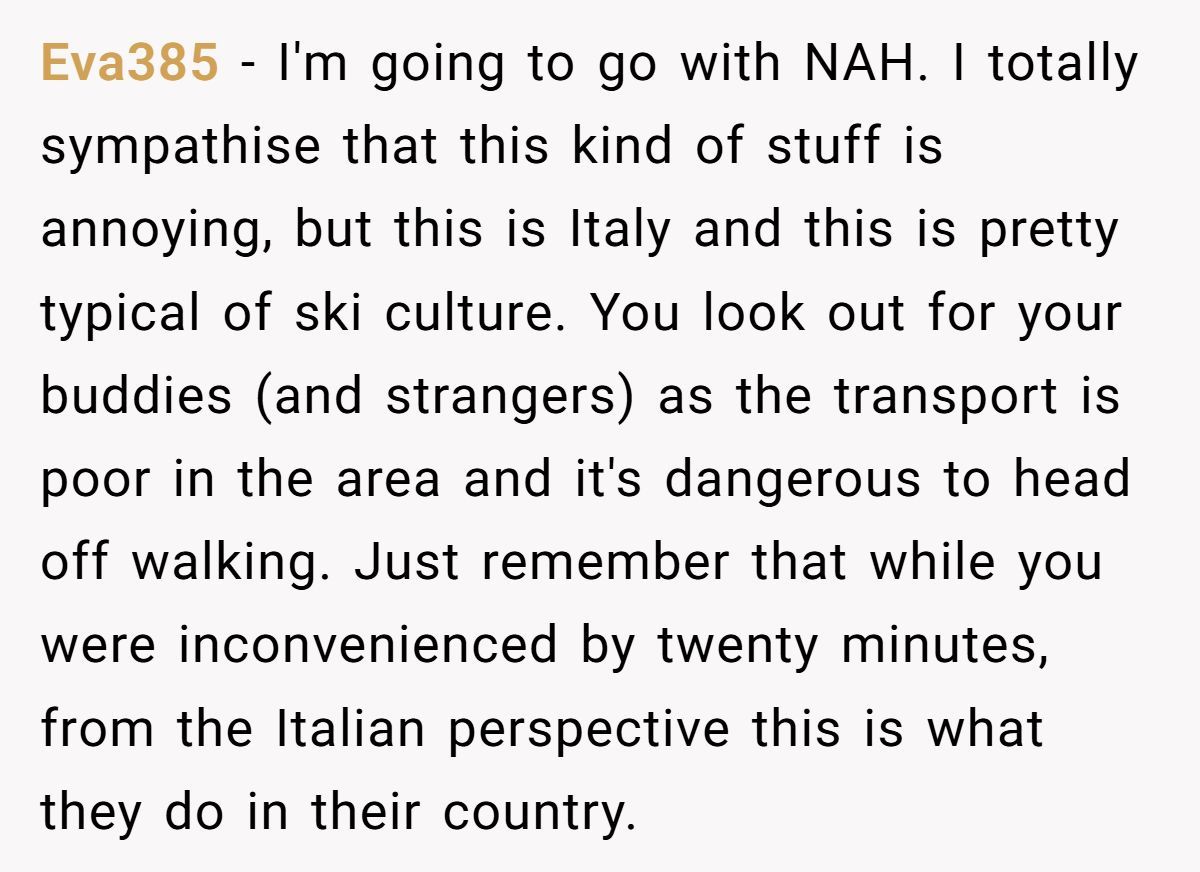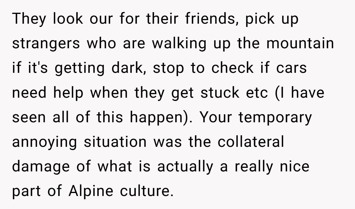Commenters explained that detours are common in Alpine ski areas, where drivers help locals, viewing the delay as part of Italy’s community-focused culture