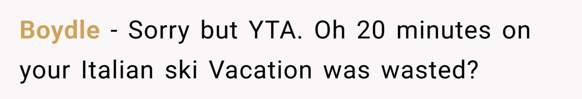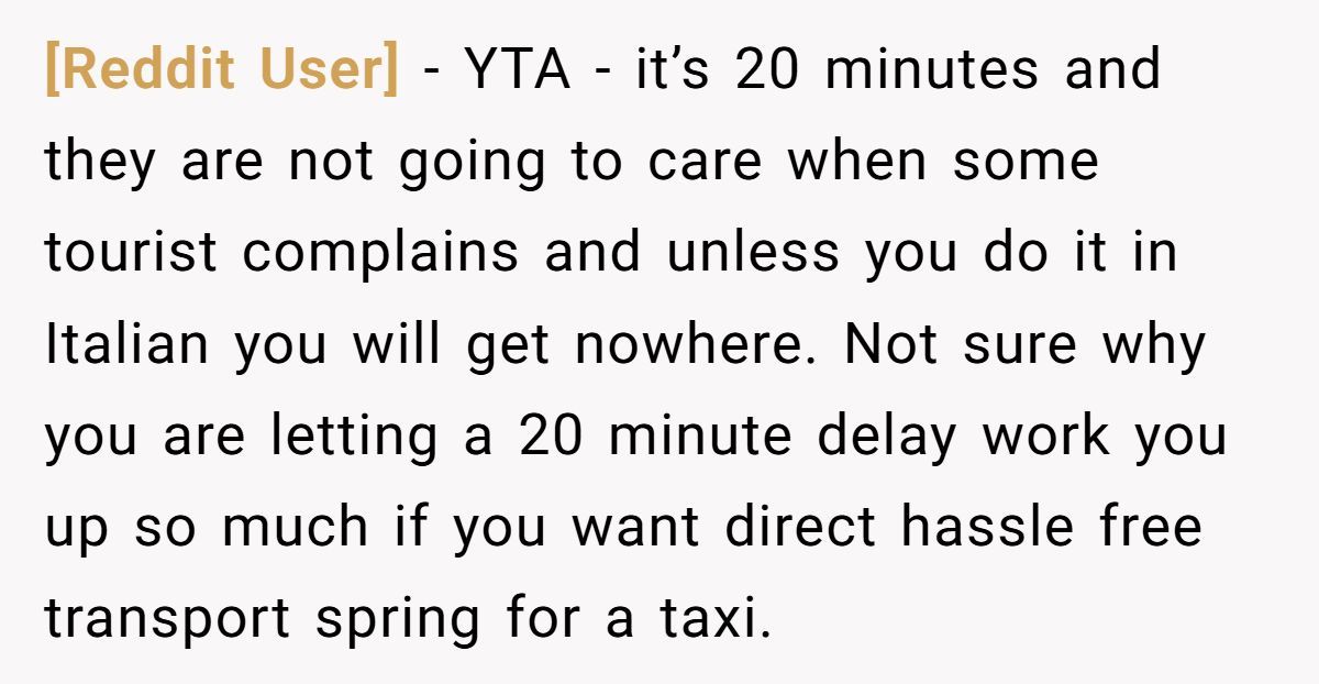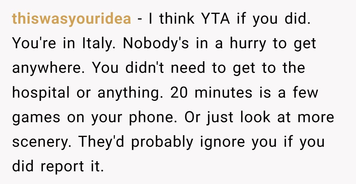 Commenters labeled her YTA for letting a 20-minute delay ruin her trip, noting Italy’s laid-back pace and that no urgent plans were disrupted