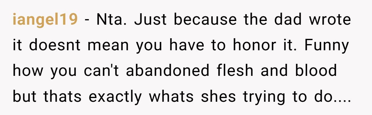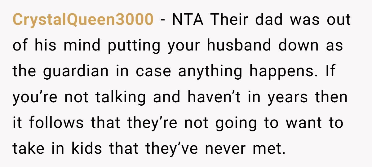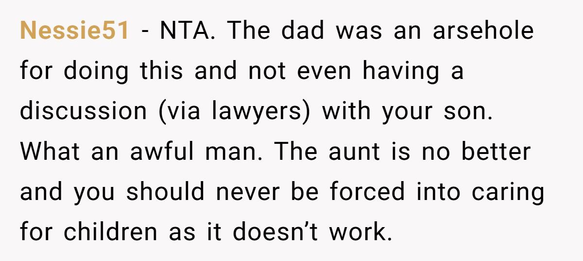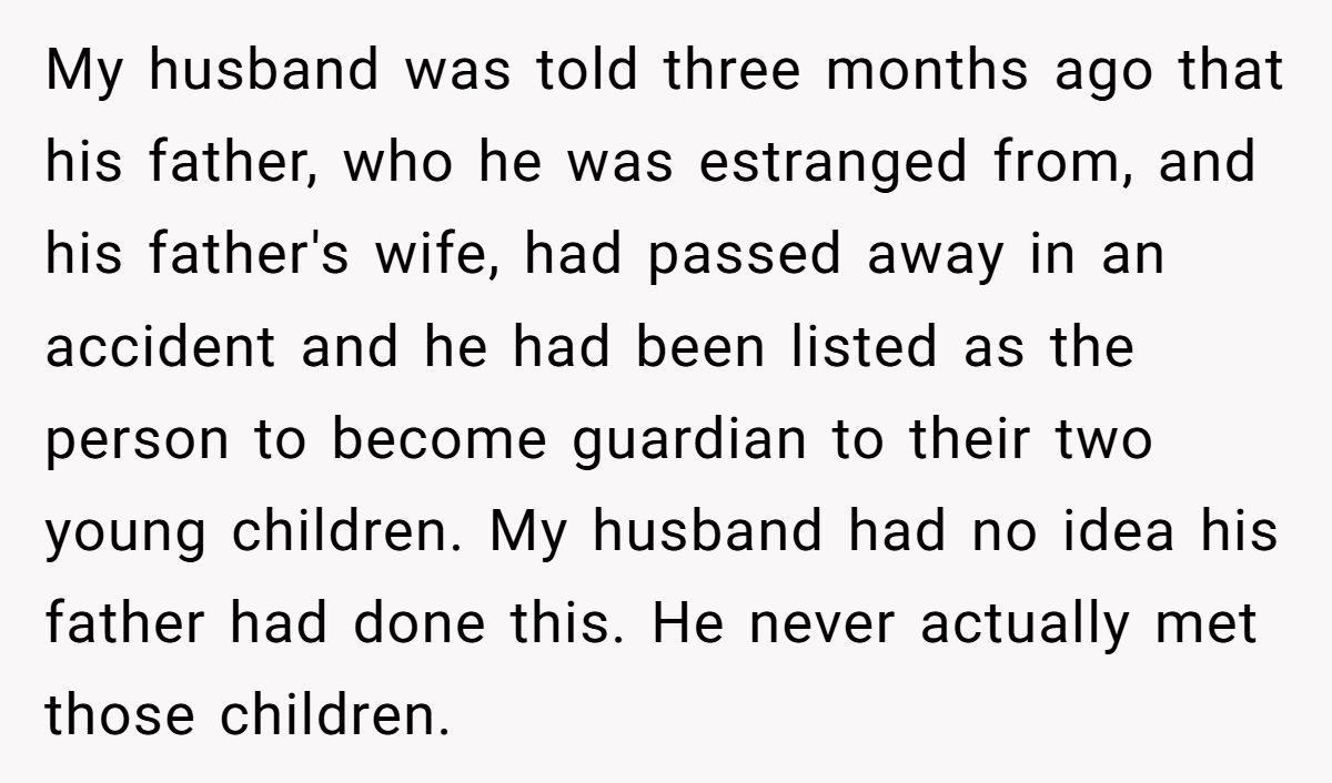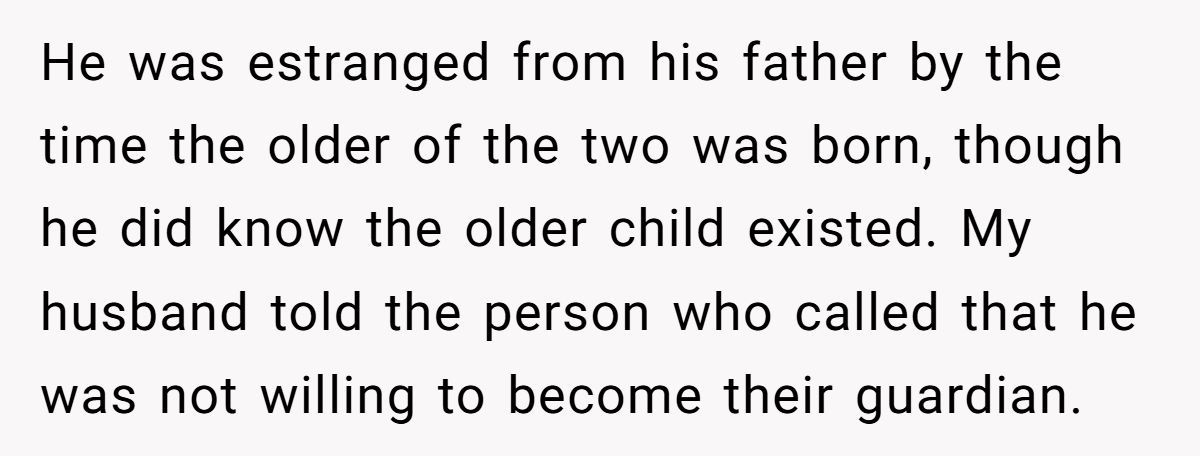 Her husband was unexpectedly named as guardian for his half-siblings after his estranged father died. He declined, and his aunt agreed to take the kids. Now she’s demanding OP take responsibility too. But OP firmly refused—and the aunt insisted. Think cookies and judgmental stares. Want the full spill? Grab a seat.