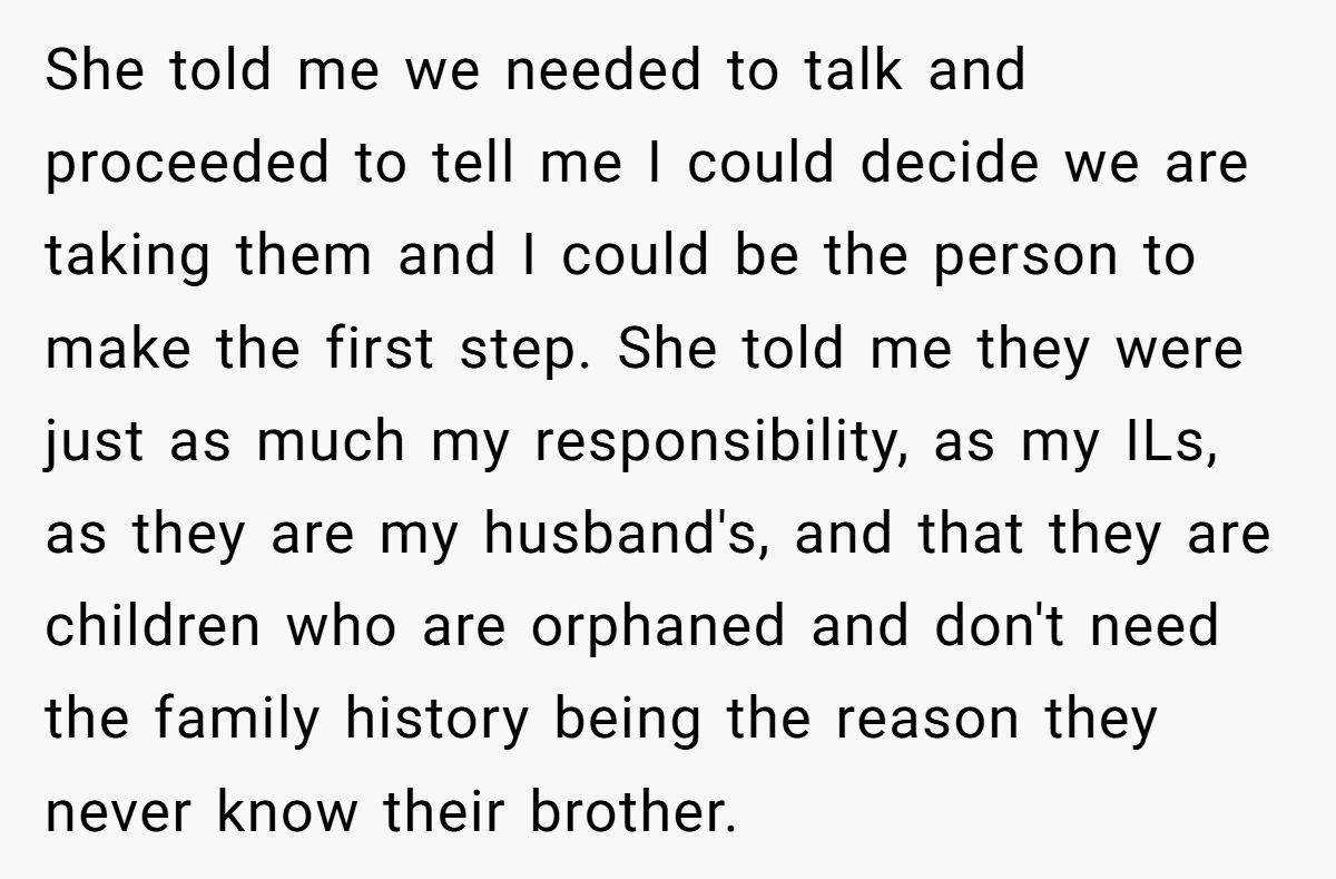 One woman shared a story of standing up to her husband’s aunt, who insisted she and her husband take in his two young half-siblings after their parents’ sudden death