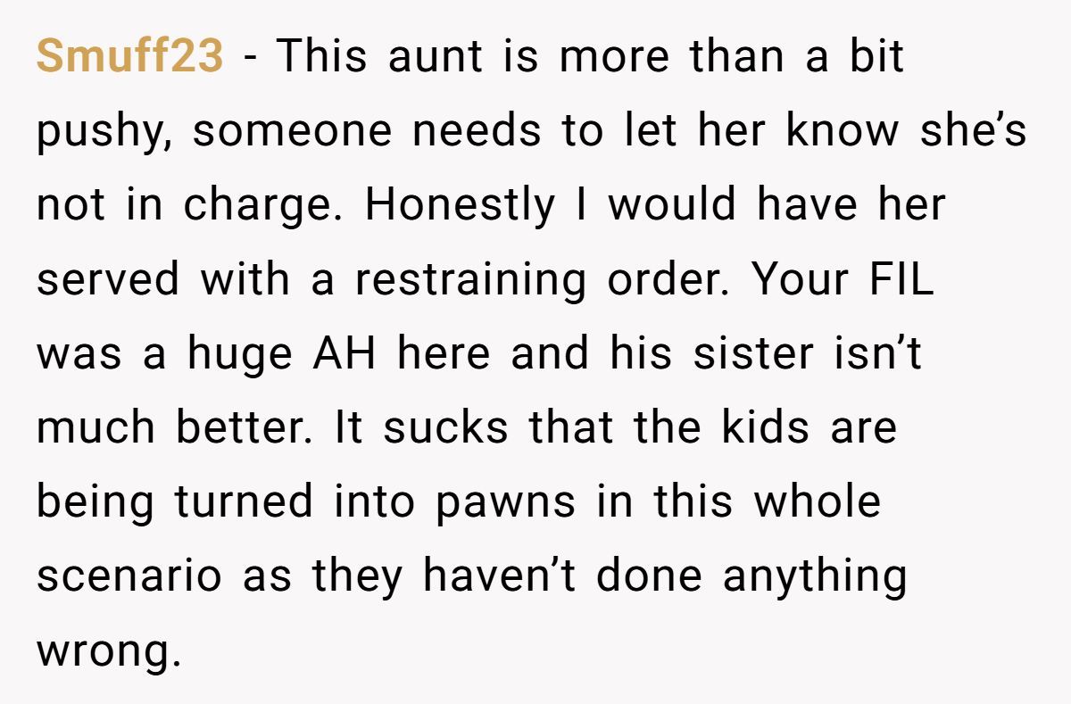 Some claimed the aunt’s tactics were coercive, advising the Redditor to take legal steps