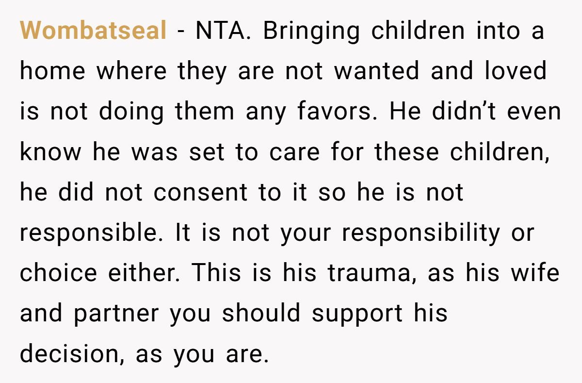 This wasn’t a story about childcare—it was about agency. OP and her husband were firmly aligned: they will not parent children they do not know and don’t emotionally connect with.